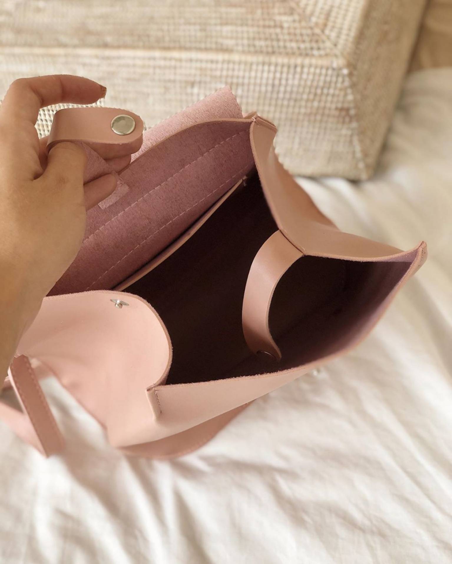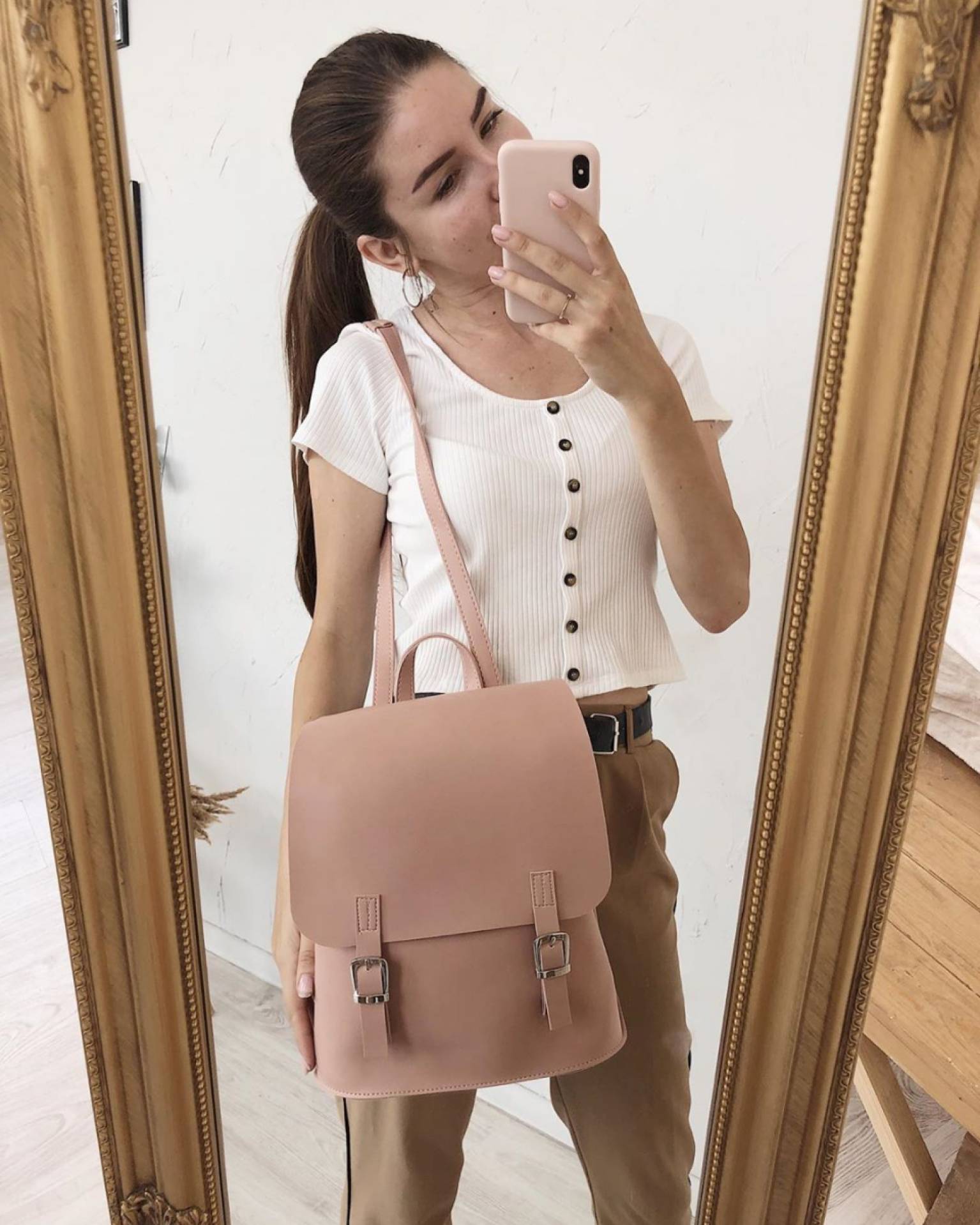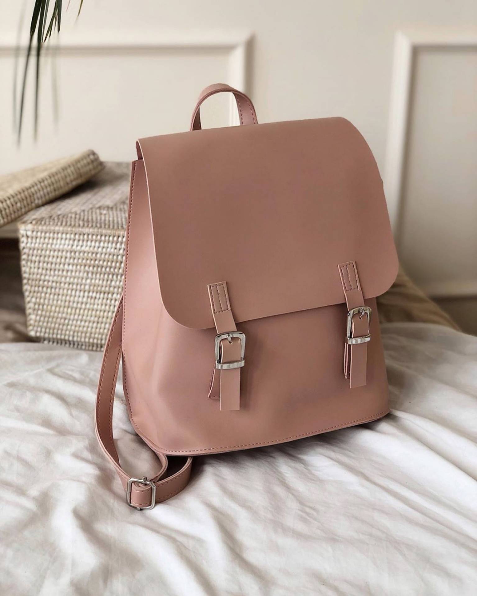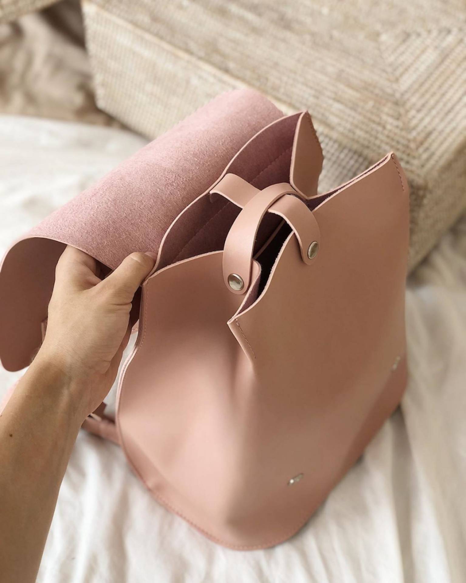 Изготовлен из эко-кожи. Ремни можно отрегулировать так, что рюкзак становится сумкой. Внутри есть большой карман, который можно сужать.