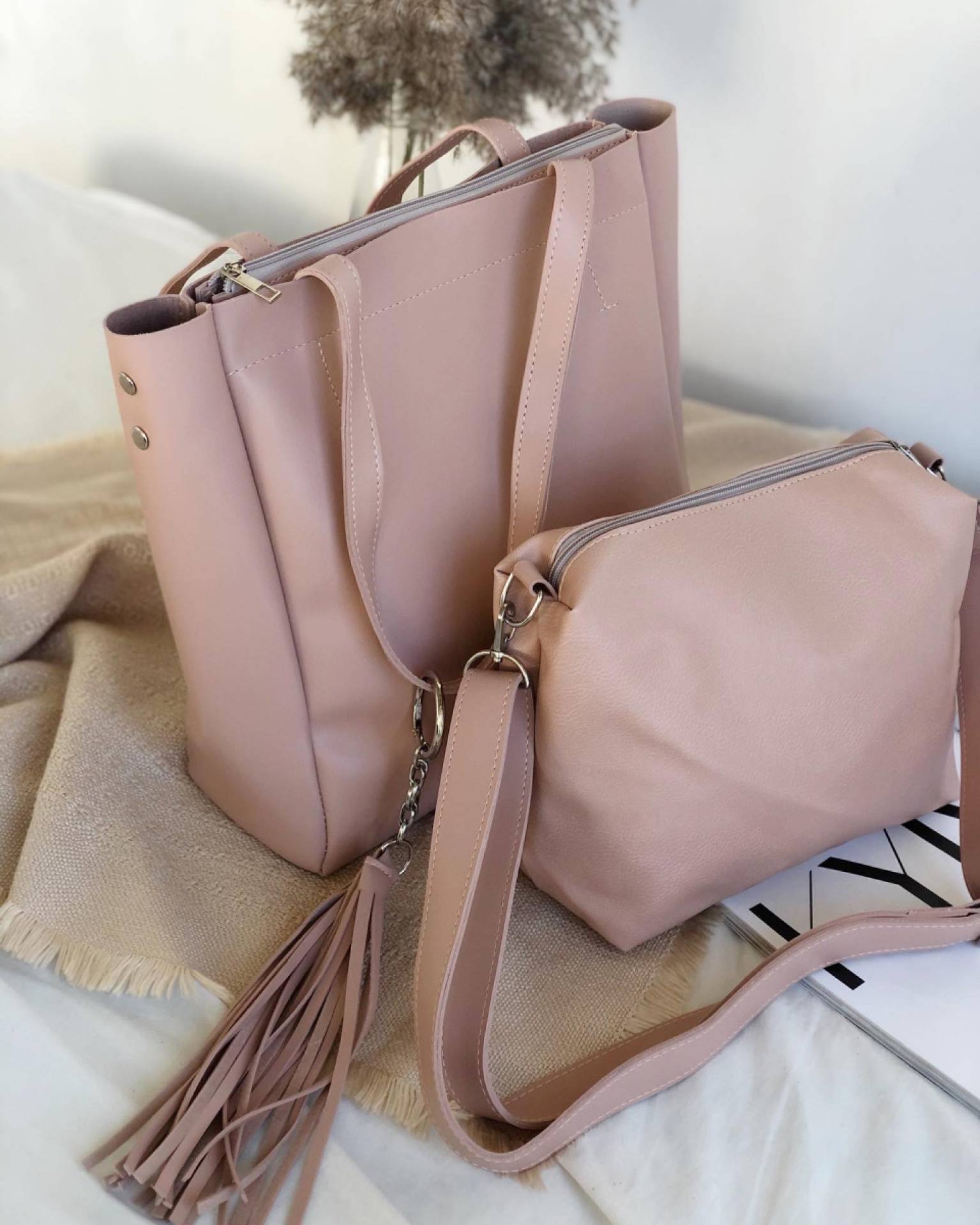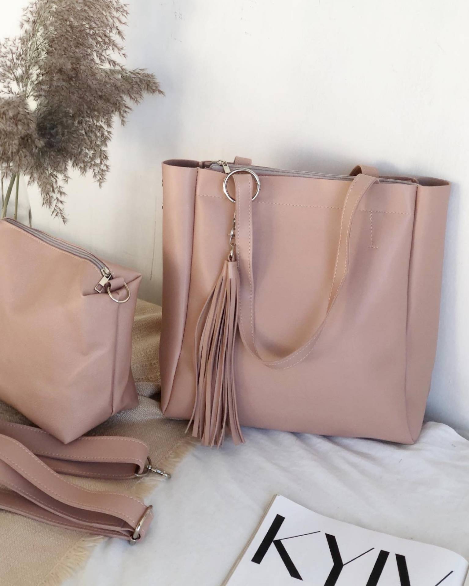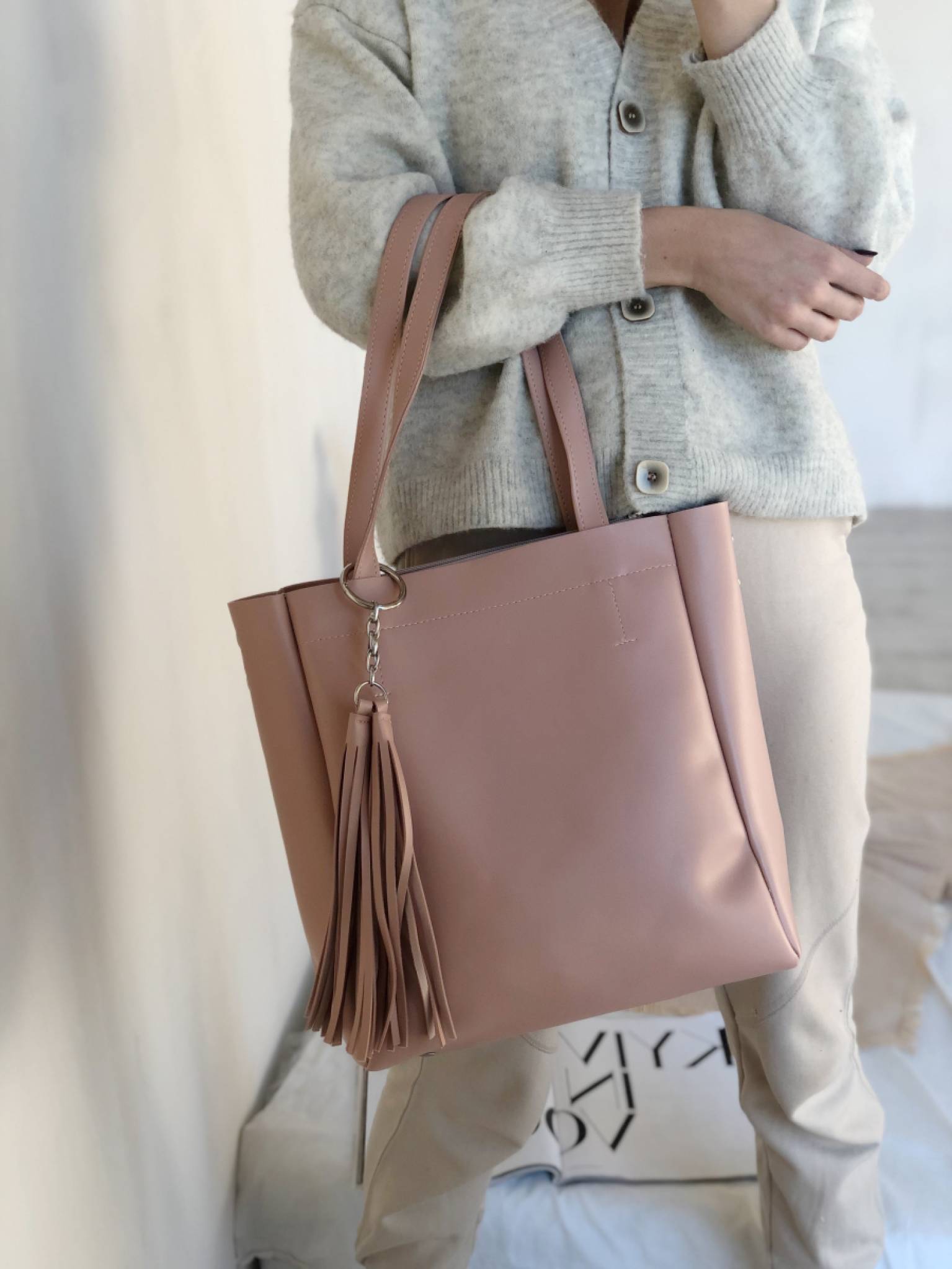 Шоппер "Равенна" с кисточками с длинными ручками и ремнем Romashka, Пудра (736)